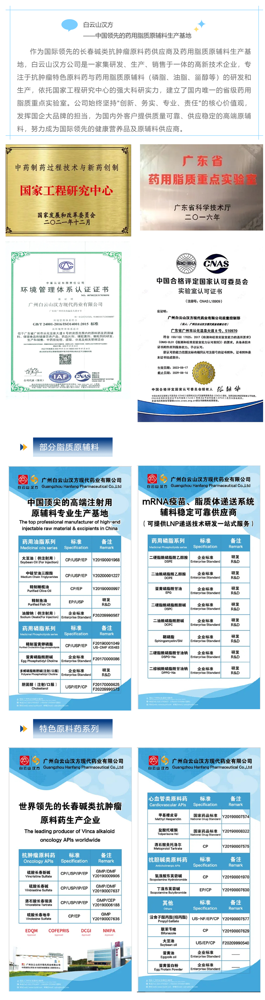白云山漢方憑借卓越的質量管理體系與科研實力,榮獲ISO14001環(huán)境管理體系認證和CNAS實驗室認可證書。公司產品更斬獲墨西哥Cofepris、印度DCGI、歐盟CEP、美國FDA US-DMF和日內瓦國際發(fā)明展金獎等多項國際注冊認證。此次參展的高端脂質系列注射用原輔料及全球領先的以長春堿系列抗腫瘤為代表的特色原料藥,獲得參會行家以及業(yè)界的高度認可,多家企業(yè)主動拋出合作“橄欖枝”,展現出迫切的合作意愿。